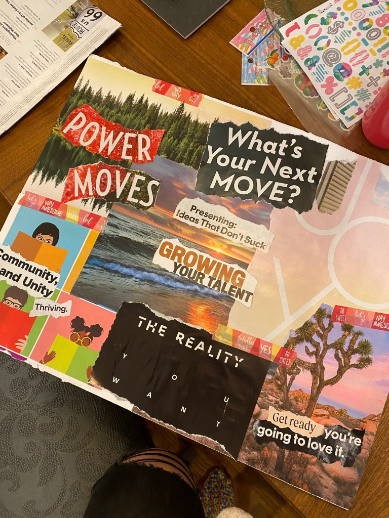 I started the new year by creating two vision boards (at 2 separate events). So.much.visioning! One session started with a guided meditation and green was the dominant color I saw – hence the very green board. Green often symbolizes good health and nature and is the color of the heart chakra – which, when in balance, is associated with love, compassion, joy, balance, and connection. My 2024 word joy continues to pop up often!